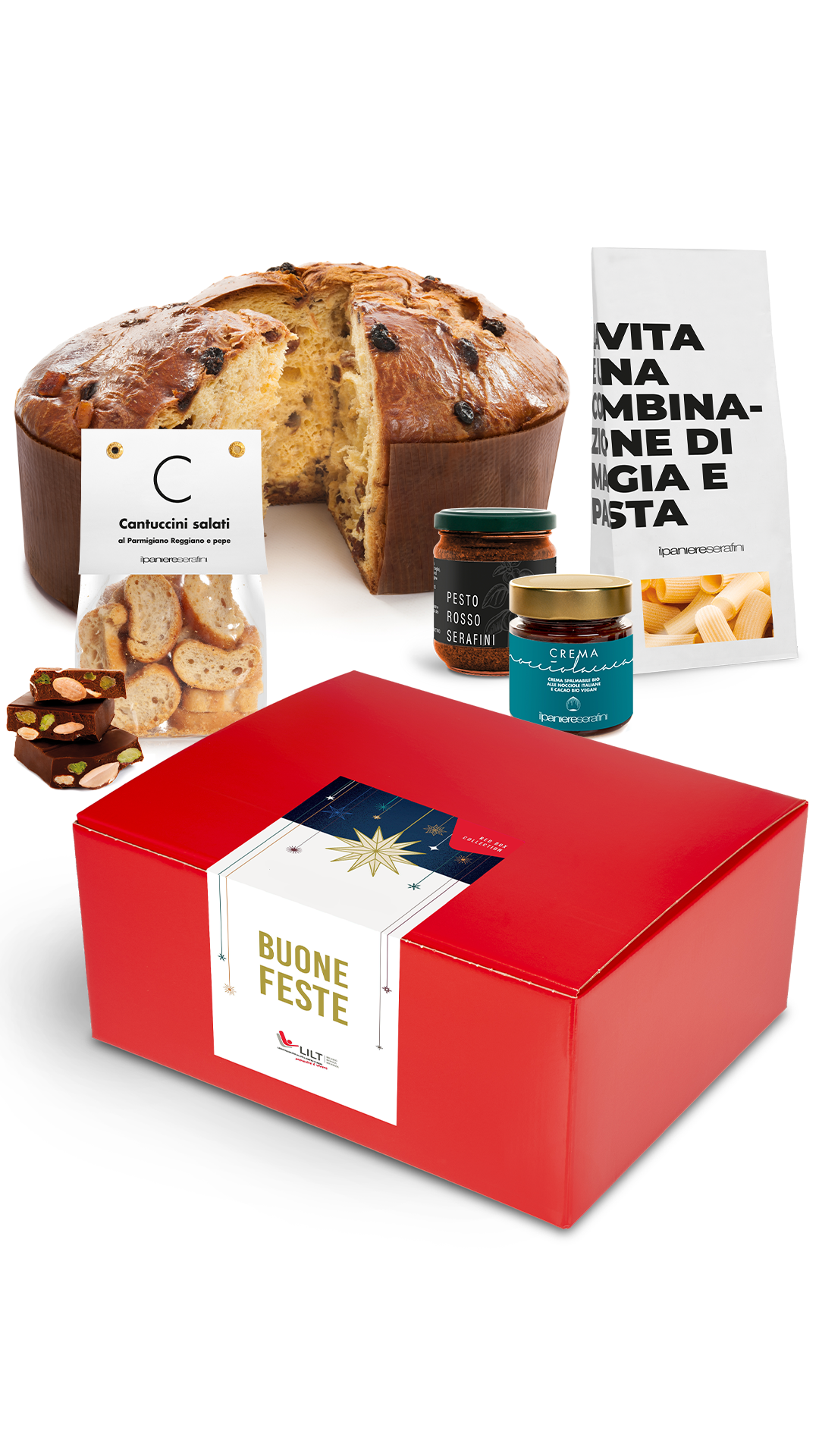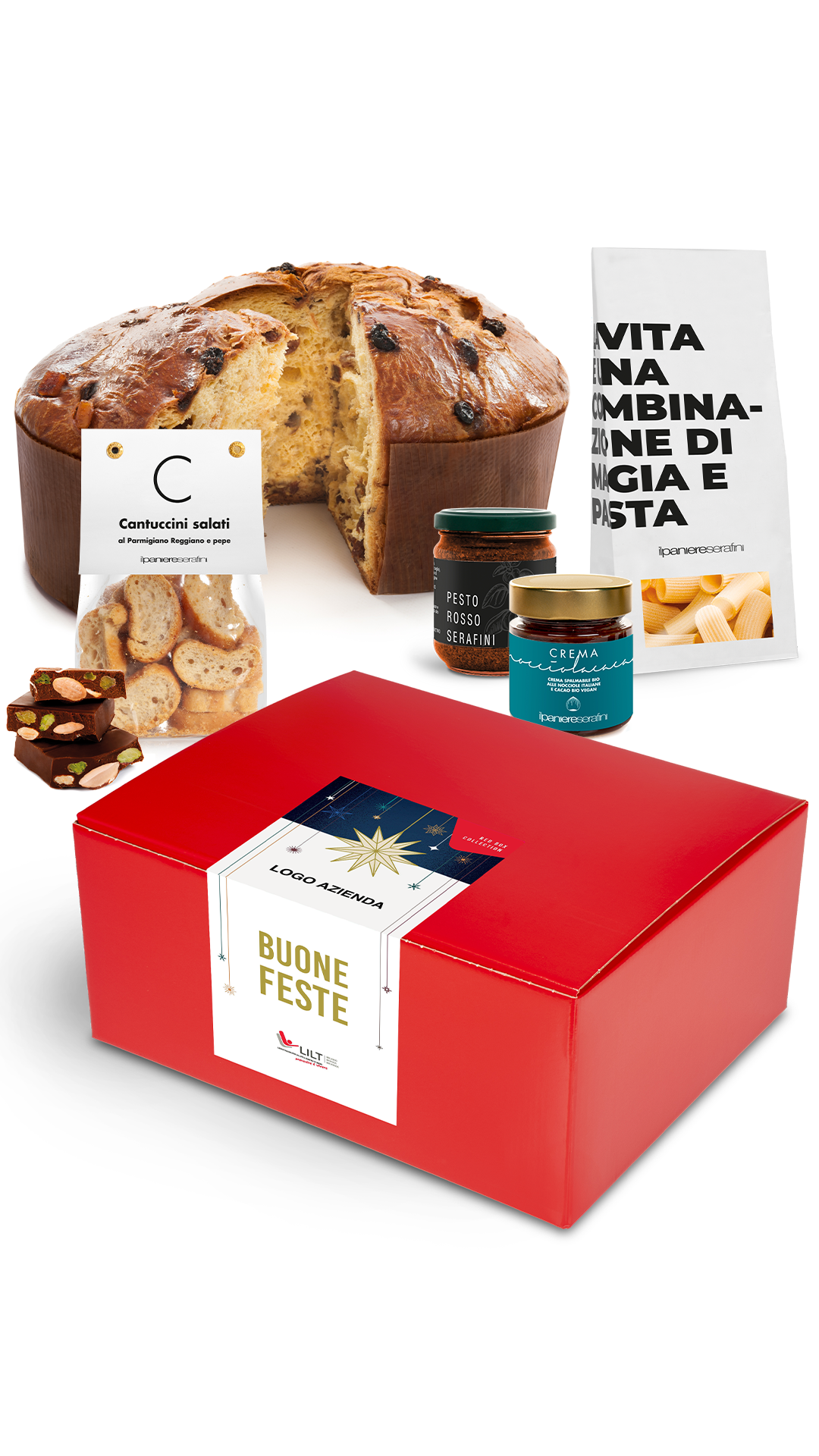 Esclusiva Red Box LILT in cartone riciclabile e certificato FSC con prodotti dolci e salati per passare le feste in buona compagnia.