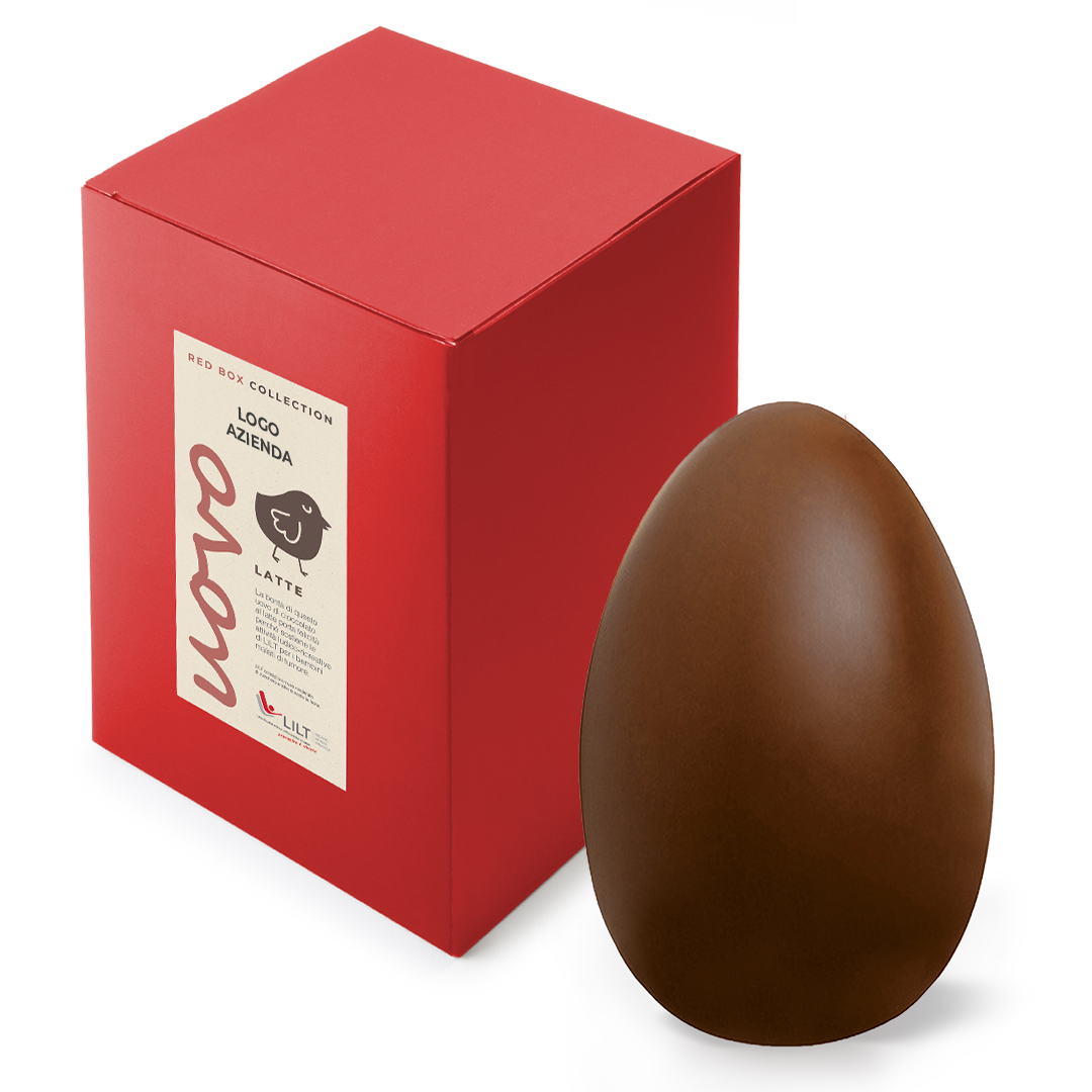 Uovo di Pasqua al cioccolato al latte da 250g. Confezionato nell’esclusiva Red Box LILT in cartone riciclabile e certificato FSC.