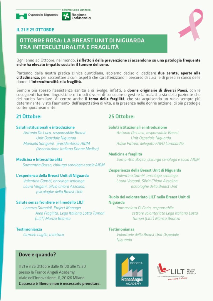 Ogni anno ad ottobre, nel mondo, i riflettori della prevenzione si accendono su una patologia ad alta incidenza e a elevato impatto sociale: il tumore della mammella. In questo contesto, la Breast Unit il Centro di senologia dell’ospedale Niguarda, ha deciso di declinare questa tematica in un’ottica diversa; due serate, aperte alla cittadinanza, per presentare le tematiche del tumore al seno in una duplice ottica, quella dell’interculturalità e quella della fragilità. Questi due temi caratterizzano profondamente la Breast Unit di Niguarda e il percorso di presa in carico delle nostre pazienti, pur rimanendo spesso nella penombra. I due incontri si terranno dalle 18 alle 19.30 alla Franco Angeli Academy, Viale dell’Innovazione 11, Milano.