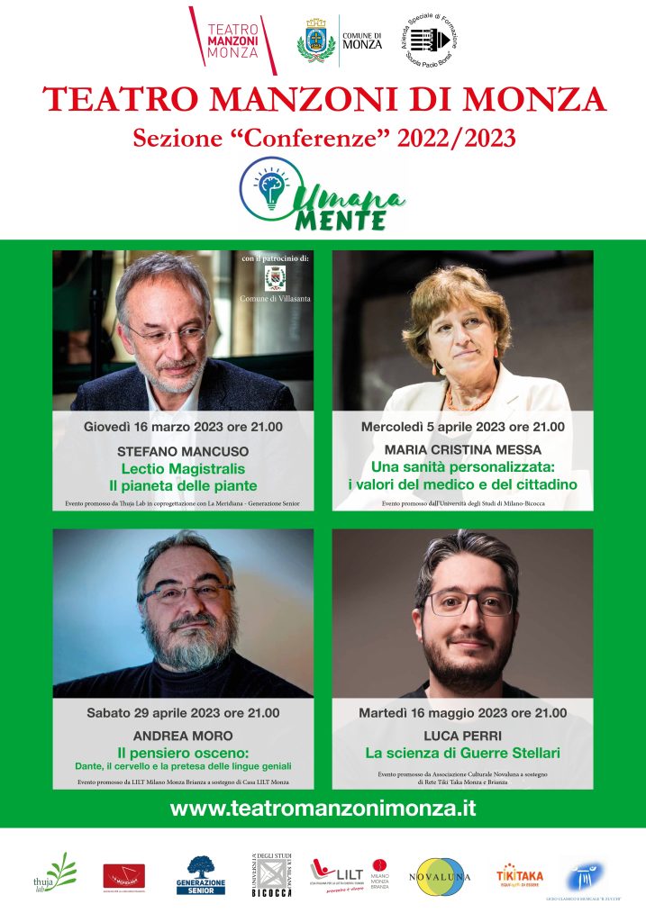 “UmanaMENTE” è il nuovo ciclo di conferenze inserito nell’ambito della programmazione culturale del Teatro Manzoni di Monza. “Inauguriamo una nuova sezione dedicata all’approfondimento culturale all’interno della programmazione artistica del Teatro Manzoni – spiega l’Assessora alla Cultura Arianna Bettin –. Una proposta che mette al centro l’essere umano, il sapere e il rapporto con la scienza. Quattro appuntamenti che uniscono insieme divulgazione scientifica, musica e solidarietà”.