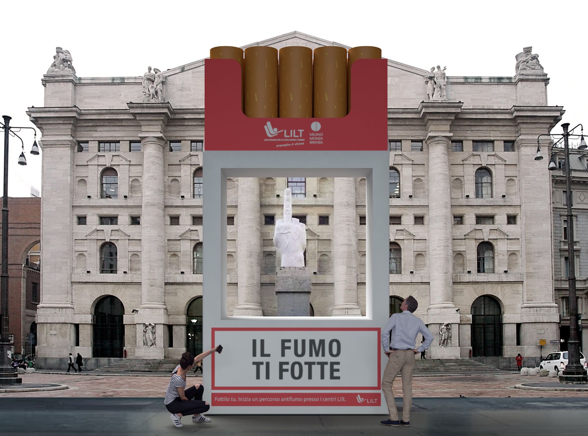 In Piazza Affari a Milano, un enorme pacchetto di sigarette incornicia con un gioco di prospettive l’iconica statua di Maurizio Cattelan. Riporta la scritta “il fumo ti fotte” e riprende i messaggi di prevenzione che oggi troviamo sui pacchetti di tabacco e sigarette. Una decisa opposizione a questa abitudine dannosa e sottolinea l’impegno di LILT e delle Istituzioni milanesi per raggiungere il traguardo di Milano Senza fumo.