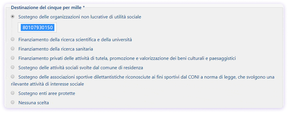 - Inserisci il Codice Fiscale di LILT Milano. Nel riquadro destinato al sostegno degli Enti del Terzo Settore, iscritti nel RUNTS, inserisci il codice fiscale di LILT Milano: 80107930150.