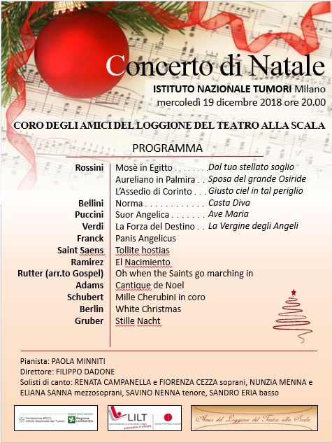 Mercoledì 19 dicembre alle ore 20 nella Chiesa dell’Istituto dei tumori di Milano (9° piano) si terrà il tradizionale Concerto di Natale degli Amici del Loggione del Teatro alla Scala, diretto da Filippo Dadone.