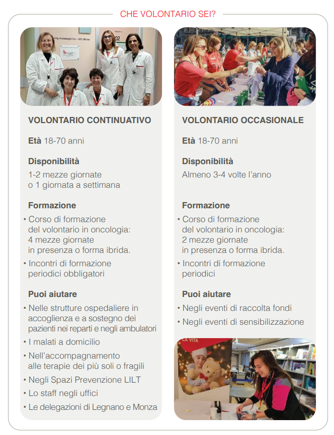 C’è chi, ancora, si mette in gioco nel supporto di eventi di raccolta fondi, occupandosi degli accrediti degli ospiti o di aiutare negli allestimenti. Qualcuno inoltre si mette a disposizione nella sensibilizzazione alla prevenzione durante campagne ed eventi come Nastro Rosa, Nastro Blu o il Cancer survivors Day.
