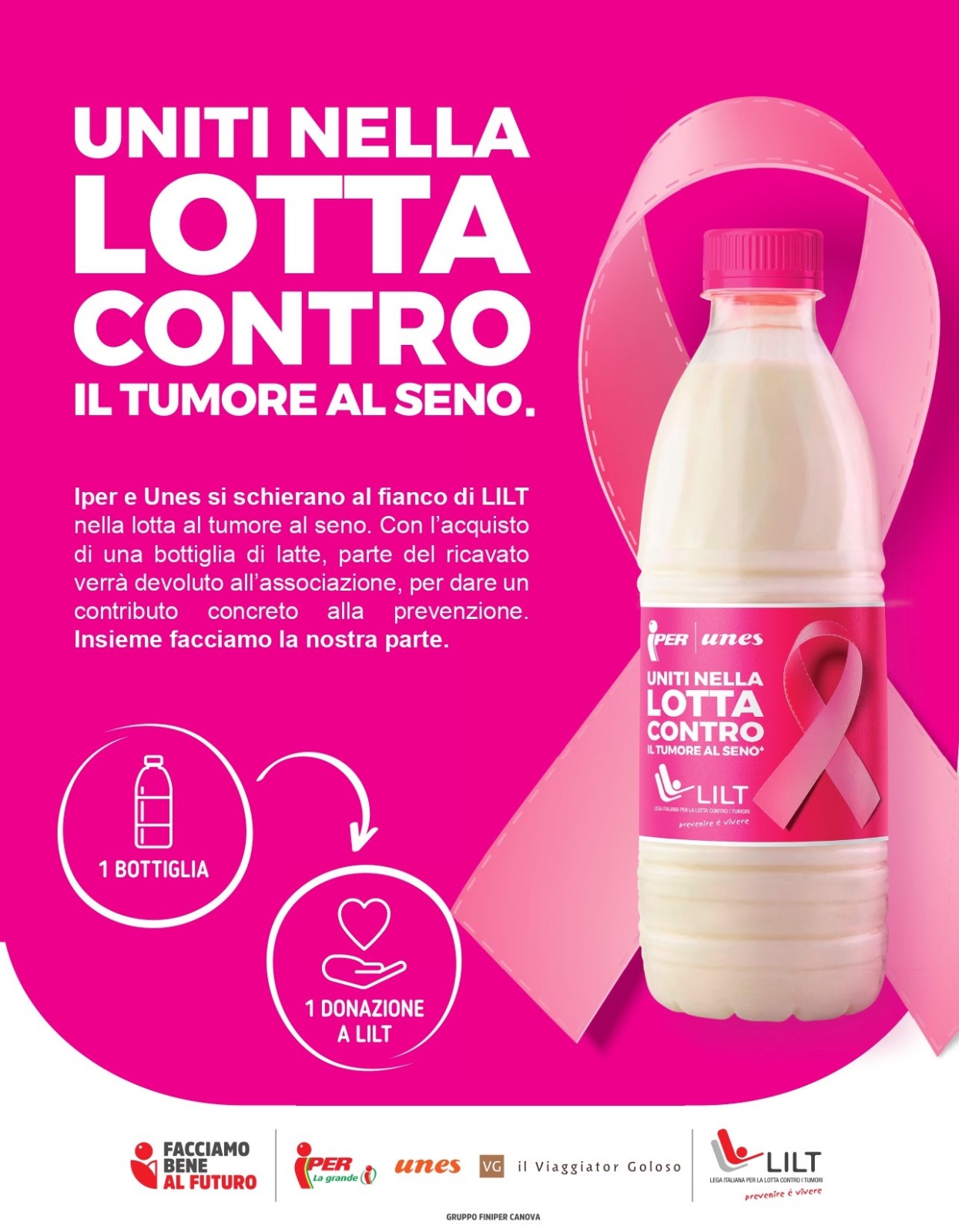 Per celebrare l’arrivo di ottobre, il mese rosa dedicato alla prevenzione dei tumori femminili, dal 22 settembre 2025 fino al 31 gennaio 2026, in tutti i punti vendita Iper La grande i, supermercati Unes e il Viaggiator Goloso aderenti all’iniziativa, sarà possibile acquistare una bottiglia di Latte Iper/Unes personalizzata con la grafica del fiocco rosa, simbolo della campagna Nastro Rosa. A fronte dell’acquisto di ogni bottiglia di latte, infatti, parte del ricavato verrà devoluto a LILT per supportare il finanziamento dei progetti di ricerca e prevenzione sul cancro.