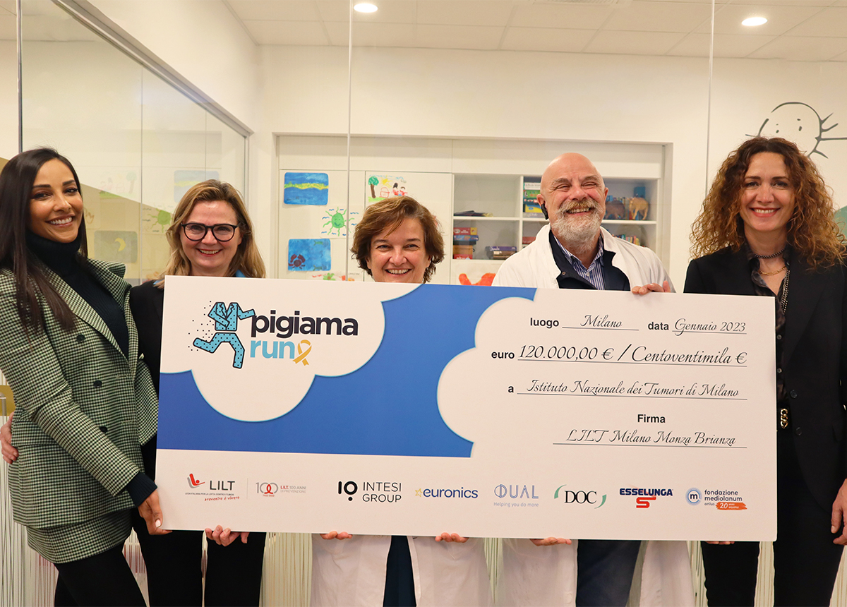 LILT ha consegnato all’Istituto Nazionale dei Tumori il ricavato della corsa non competitiva, a sostegno del servizio di reperibilità telefonica H24 per le famiglie dei bambini malati di tumore. Con LILT Fondazione Mediolanum Onlus che ha raddoppiato i primi 20mila euro raccolti con la Pigiama Run.