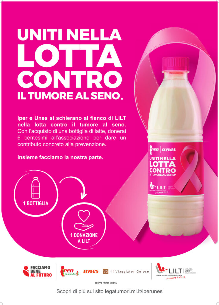 A partire dal 22 settembre, in tutti i punti vendita Iper La grande i, supermercati Unes e il Viaggiator Goloso aderenti all’iniziativa, sarà possibile acquistare una bottiglia di Latte Iper/Unes personalizzata con la grafica del fiocco rosa, simbolo della campagna Nastro Rosa. Per ogni bottiglia acquistata, dal 22 settembre 2025 fino al 31 gennaio 2026, 6 centesimi saranno donati alla LILT, per sostenere la lotta contro il tumore al seno.