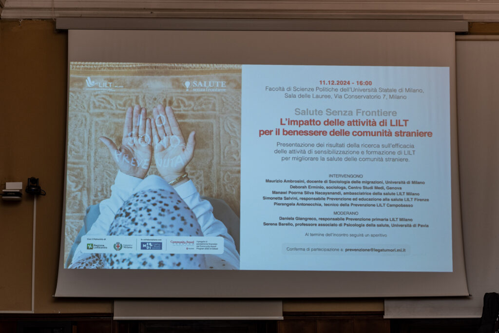 L’11 dicembre abbiamo presentato i risultati di una nuova ricerca, “Salute senza Frontiere: L’impatto delle attività di LILT per il benessere delle comunità straniere” presso la Facoltà di Scienze Politiche dell’Università Statale di Milano. A moderare la presentazione: Daniela Giangreco, responsabile prevenzione primaria LILT Milano e Serena Barello, professore associato di psicologia della salute all’Università di Pavia. Con noi anche la LILT di Firenze e di Campobasso.