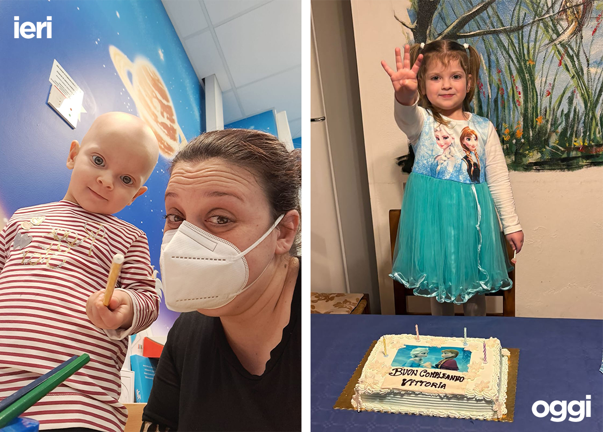 Avevo notato una pallina sul sederino di Vittoria, a volte la sentivo, a volte no. Eravamo al mare quando ho chiesto a mia cognata, che è medico, se era il caso di farle un’ecografia. Siamo andati in ospedale ed è arrivata la diagnosi che nessun genitore vorrebbe mai sentire: un rabdomiosarcoma alveolare di quasi 10 cm, in stadio avanzato.