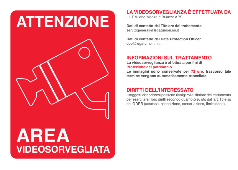 Questa pagina descrive, nel dettaglio, le informazioni sul trattamento dei dati personali effettuati dagli impianti di videosorveglianza di LILT Milano Monza e Brianza all’interno dei propri spazi.