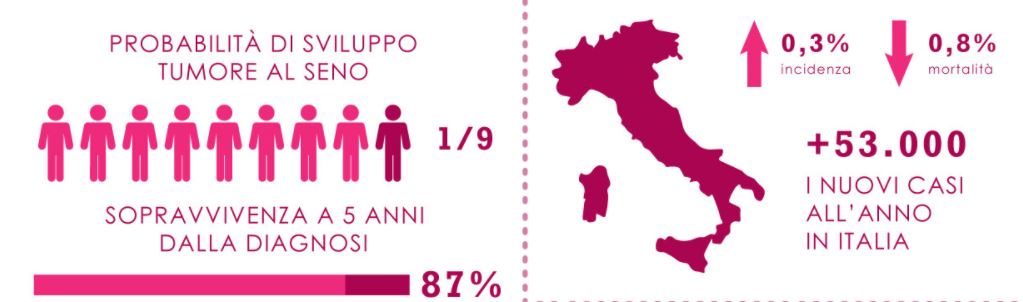 Il tumore al seno è il primo tra i carcinomi femminili con 925.000 donne viventi in Italia dopo una diagnosi di tumore (dati AIOM 2024). La sua incidenza è in continuo aumento con 53.686 nuove diagnosi (questo dato relativo al 2024) ogni anno. Nonostante la crescita annuale della sua incidenza, si registra una lenta ma progressiva diminuzione della mortalità, grazie a una maggiore informazione e sensibilizzazione su prevenzione e diagnosi precoce sommata all’evoluzione delle cure. Il tasso di sopravvivenza a 5 anni dalla diagnosi è salito al 91%.